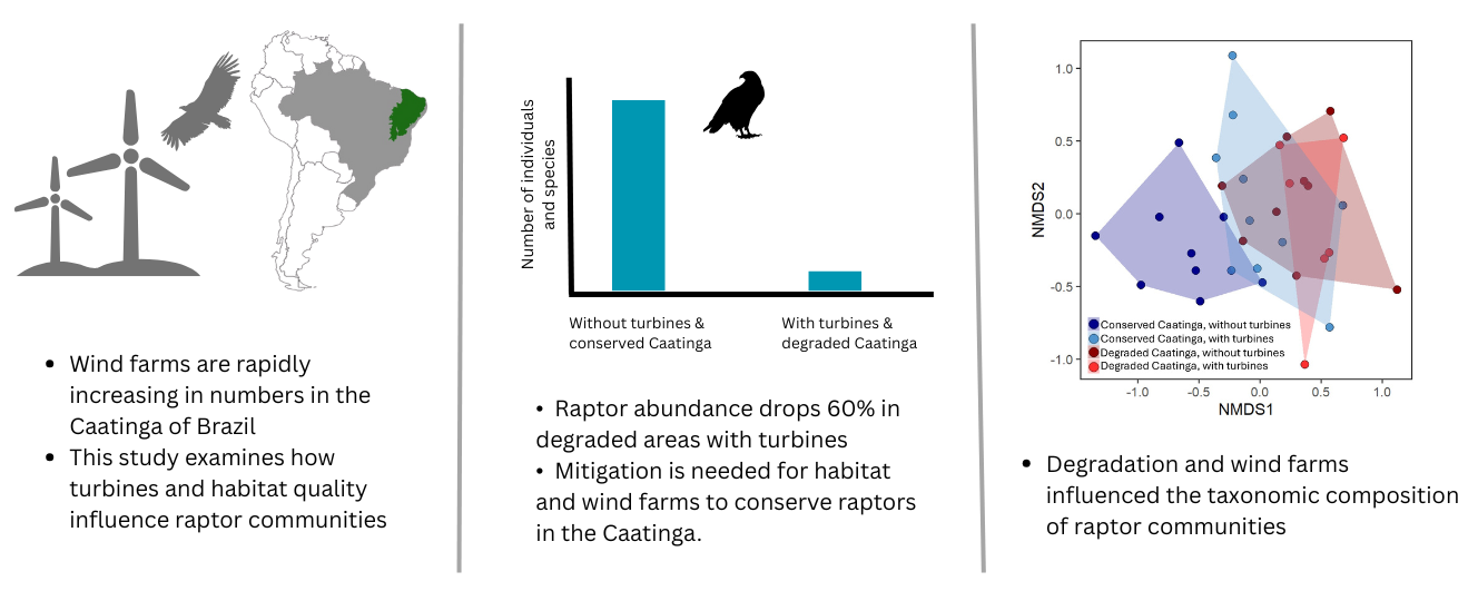 Dissertação de mestrado de Josefa Inayara Silva (artigo em revisão) - As comunidades de aves de rapina em parques eólicos ou em habitats com vegetação degradada representam um subconjunto das espécies encontradas em áreas sem parques eólicos e com vegetação natural mais preservada. A riqueza e a abundância de espécies de aves de rapina são reduzidas em parques eólicos e em habitats degradados. Aves de rapina grandes ou especializadas são as mais negativamente afetadas por esses parques eólicos e pela degradação do habitat.