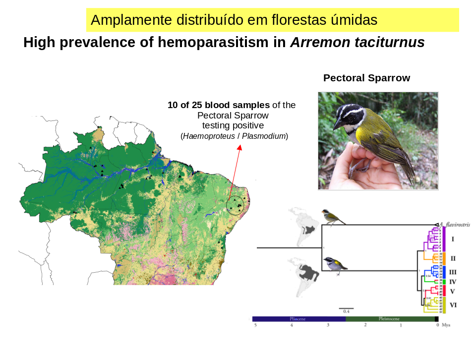 O objetivo geral do estudo é investigar comparativamente a dinâmica de transmissão de hemosporídeos aviários e as relações coevolutivas entre estes parasitos e as aves co-distribuídas na Amazônica, Mata Atlântica e nas matas úmidas do interior do Nordeste do Brasil.